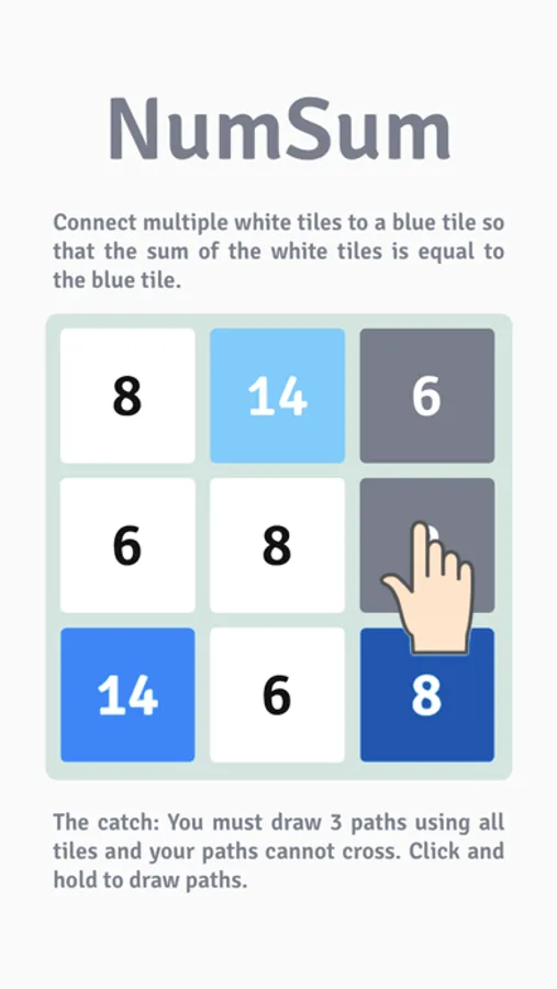 NumSum is an infinite numbers possible that is easy to master. You must connect multiple white tiles to a blue tile so that the sum of the white tiles is equal to the blue tile (e.g. white tile 8 + white tile 6 = blue tile 14).