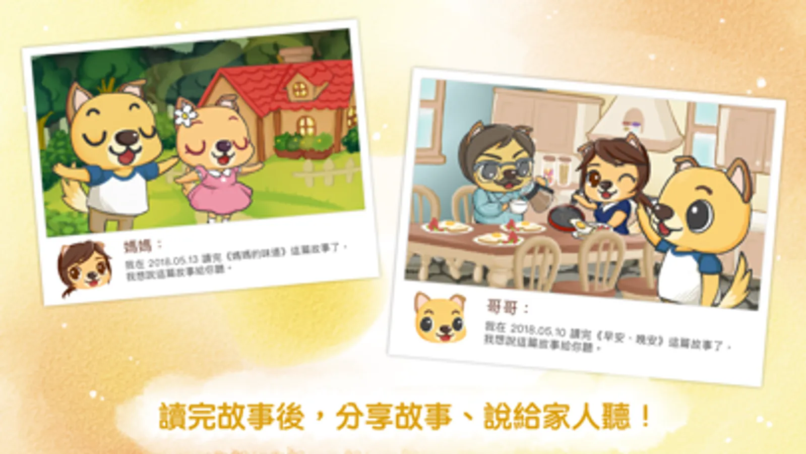 此外,我們在每個故事的最後設計了讓孩子與家人分享故事的環節,讓小朋友們以自己的方式與家人分享故事並增進互動。