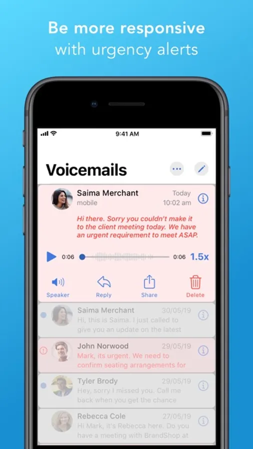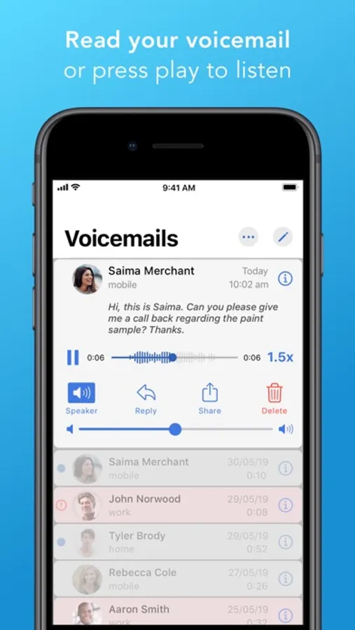 Save time or listen carefully to your voicemails with 0.8x, 1x, 1.5x, or 2x speed controls.