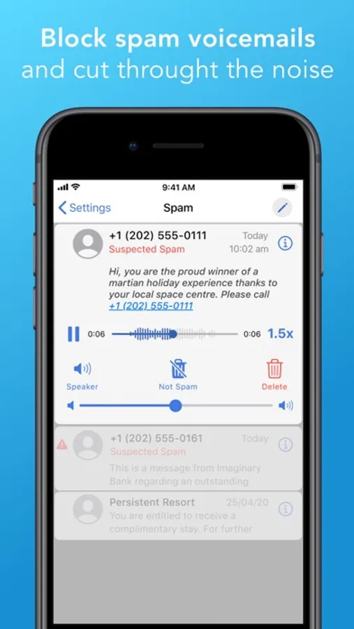 Cut through the noise and get rid of spam voicemails. Move a voicemail to the new Spam folder or mark a caller as a spammer. Artificial intelligence also automatically detects and informs you of Suspected Spam.