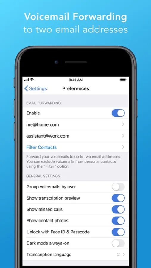 Add up to two email addresses to receive your voicemails right in your inbox. Why two email addresses? So you can boost your responsiveness by also sending voicemails to your assistant or team to respond on your behalf! Don't worry; you can filter out calls from personal contacts.