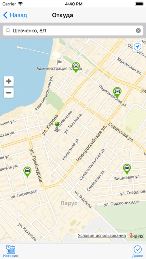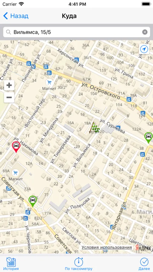 - Вызов такси без звонка диспетчеру. Отметьте точку на карте, не нужно писать длинный адрес вручную;