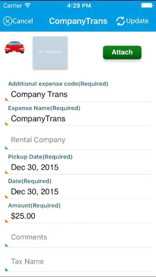 Capture receipts using the camera in your iPhone/iPad, upload them to your account, and attach them to a line item on the expense report.