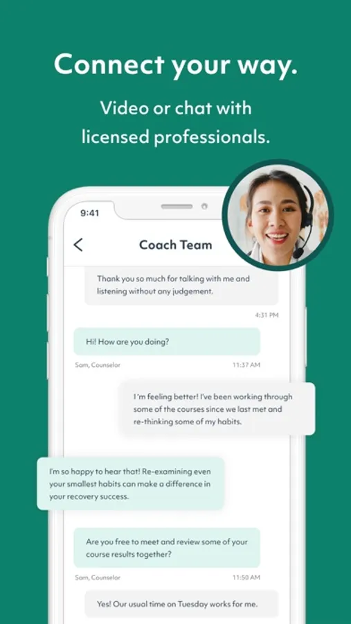 Talk to a clinician or counselor – Schedule your first appointment with your care team. Via in-app video conferencing, meet with an expert in your state who is dedicated to helping you succeed.