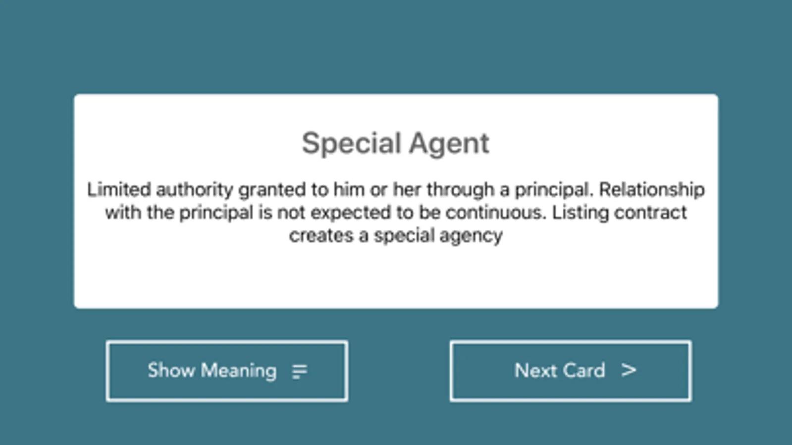 This app is a Vocabulary Flashcards app that will help you study for your Real Estate Exam. Learn all the important words and it's meaning to pass the test. Very simple to use. Remember, as the exam questions come at you randomly, the Flashcards will show the vocabulary in random order.