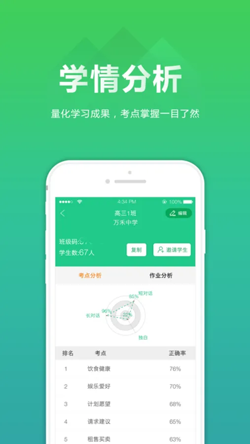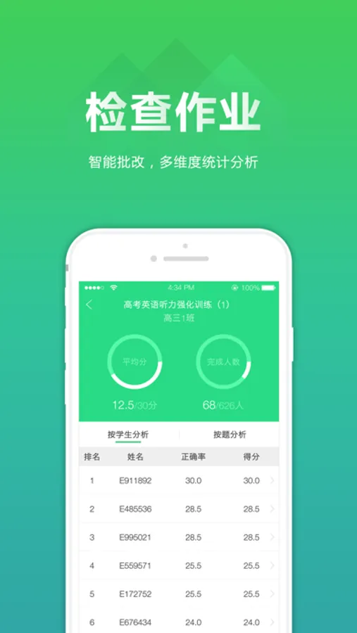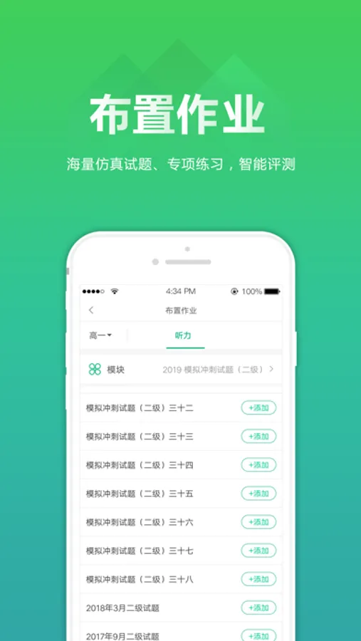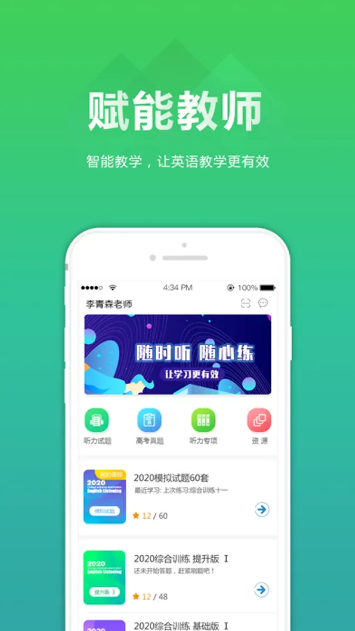 听力百分百APP教师端是一款辅助英语老师教学工具,特邀北大教授及一线老师命题、录音材料语音纯正,题材新颖,紧扣高考;老师可以创建班级、一键布置作业、学习数据智能分析,学情一目了然;让老师教学更有效。产品特点:自主创建班级、一键布置作业、智能评测、量化学习成果,考点掌握一目了然。模拟试题:同步听力百分百系列图书;听、考、练三种学习模式,个性化自主练习。考试模式听力实战测试、模拟听力考试场景;计时答题、边听边答,智能评测;错题同类题推送,举一反三。专项练习:围绕考点、试题梯度区分,针对听力考点强化训练,各个击破。听力真题:近10年高考真题,模拟考场真实场景,提前熟悉高考流程。