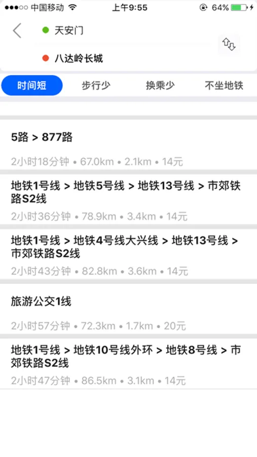 2. 功能全面:周边线路地图导航,输入起点和终点,智能规划出多种换乘方案,还可以设置规划方式(步行少、时间短、换乘少等),提供详细的可行性线路和公交站牌信息。