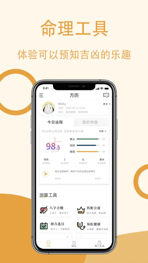 “万历”帮助人们了解在每一天中诸如运程、财富、能量、情感、桃花、健康、事业等方方面面的信息,帮助人们在做事、求财、匹配、合婚、择吉、交友、出行这些日常事务中,做出合理的安排。