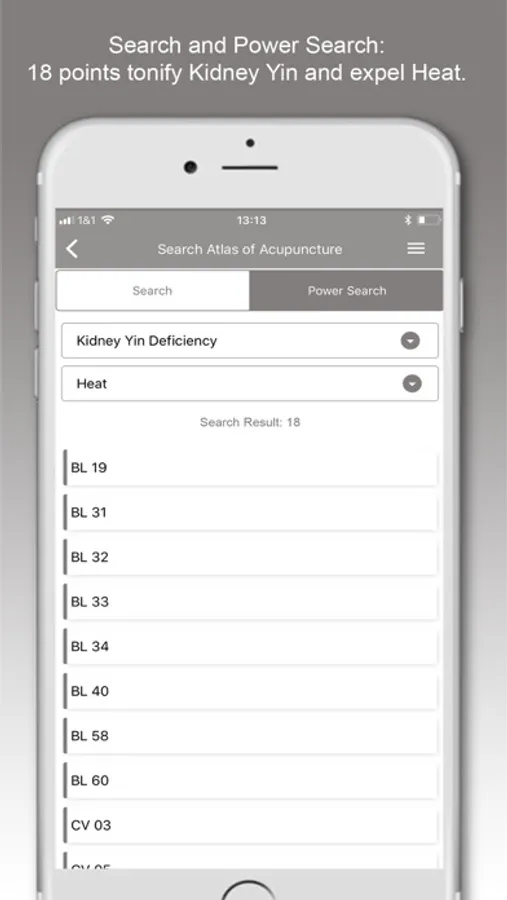 This is a unique function integrated into the Shen-Acupuncture app to help you create optimal point combinations for your treatment and save them for later use. The Power search is a brilliant addition to full-text search and has a special intelligence only available with the app. This intelligence consists of 5000 individually created links between TCM diagnoses and acupuncture points which you would never find with a full-text search.