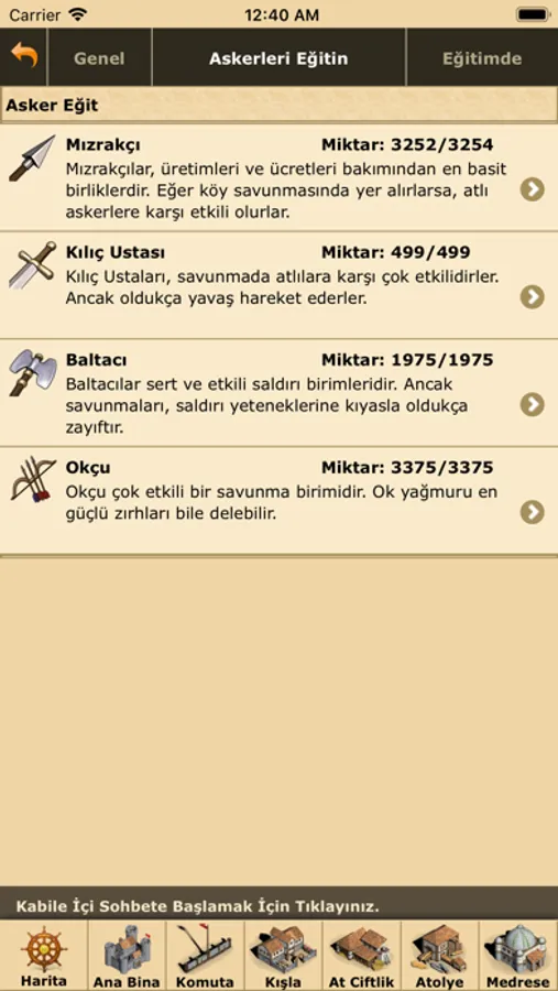 At çiftliğinizde Atlı asker üretilip. At çiftliğinizin geliştirdiğiniz her kademesinde üretiminiz daha hızlı sonuçlanacaktır.