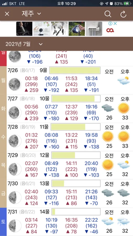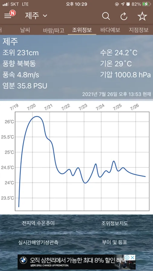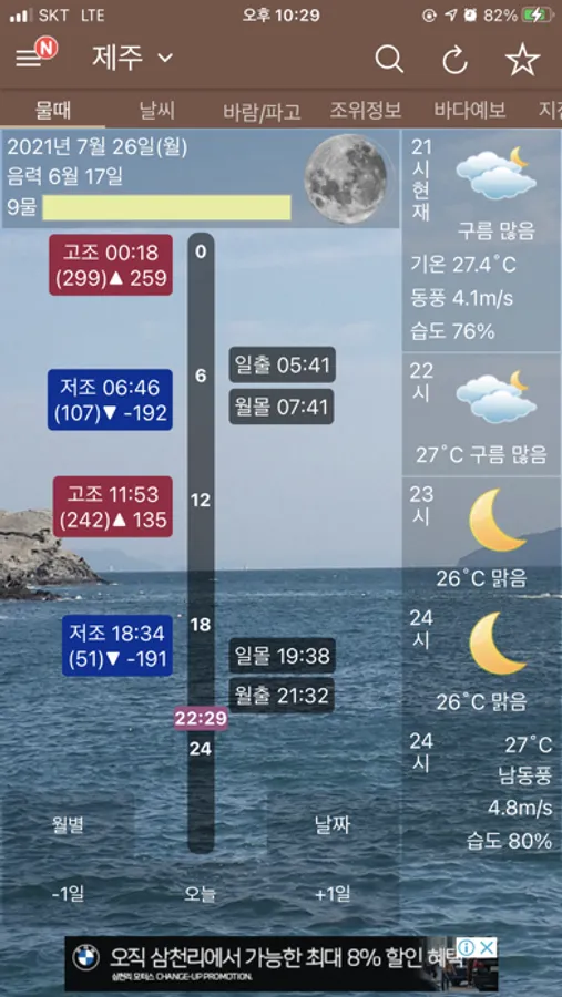 물때(조석예보 및 조위정보) - 물때표, 간만조 시간 및 조위 변화, 조위 관측 정보(조위, 수온, 풍향, 기온, 풍속, 기압, 염분농도, 일출/일몰 시각)