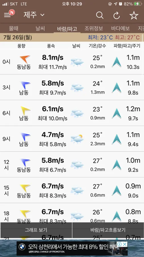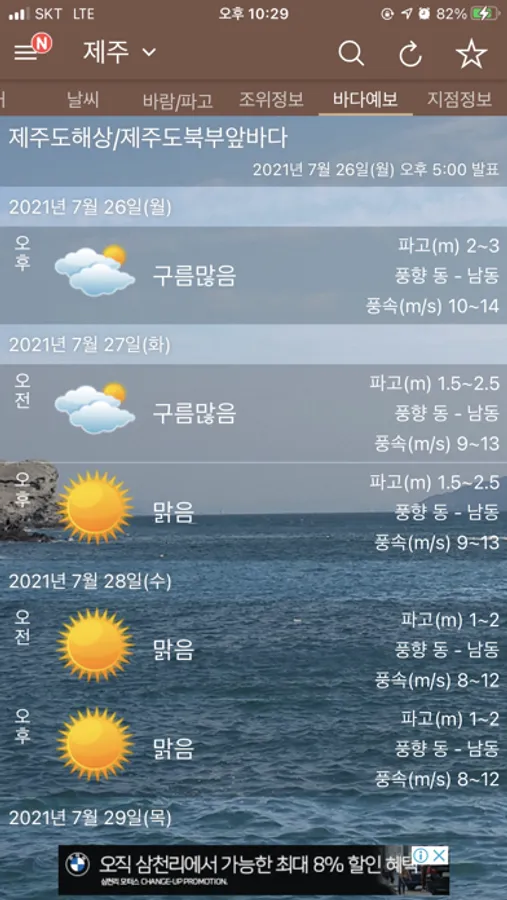 바다예보 - 가까운 바다 및 먼바다의 파고 및 풍향/ 풍속 정보