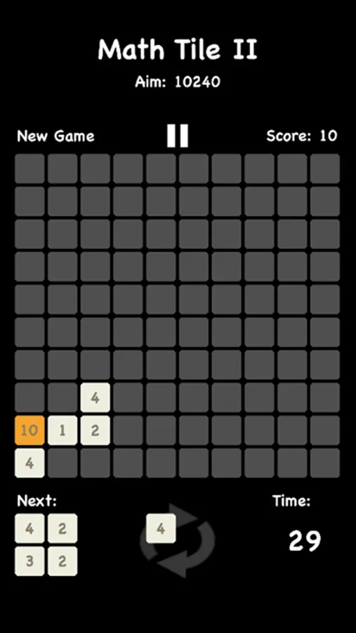 MathTile2 is a game to get 10240. The new boxes appear on the bottom of the board. If you tap boxes, the position of umbers will change. Drag the boxes on the board. If the sum of numbers on column or row is equal to 5 10 or 20, they will merge together.While two 5 10 or 20 boxes touch, they will also merge together until get number 10240.
