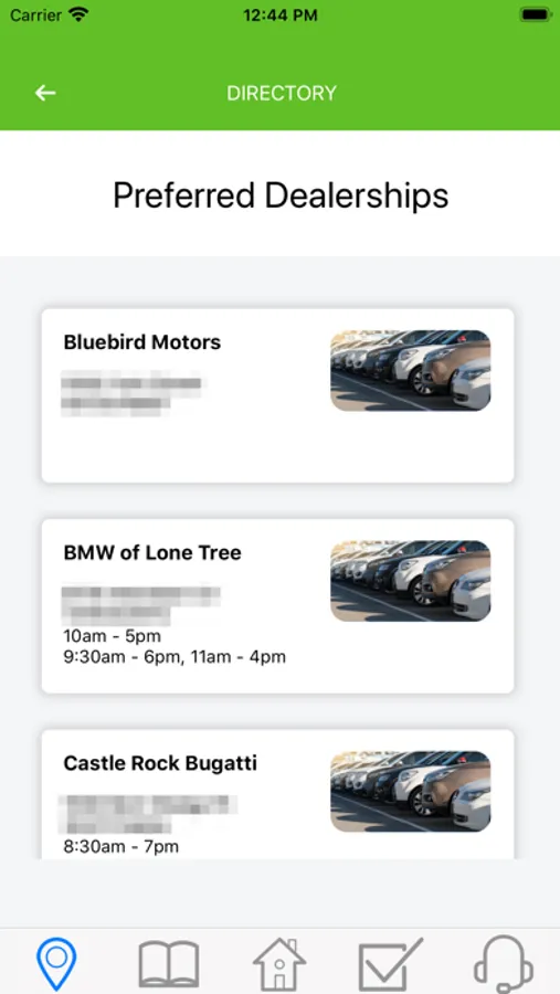 • A directory of franchise vehicle dealers with hours of operations, direct phone number, and website link.