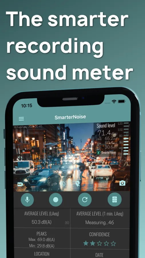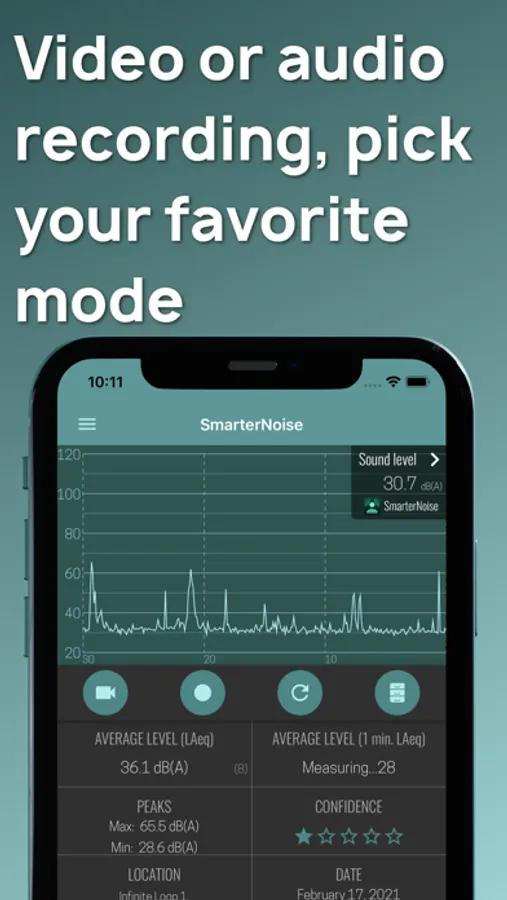 SmarterNoise is a premium sound level meter app featuring several unique functions. SmarterNoise measures sound levels in video and audio modes, records video and sound, and informs you about the risks of noise exposure. In addition, SmarterNoise includes a camera, measurement location, and easy sharing, all for free. From the archive you can view the video and audio files you've saved on your phone. With SmarterNoise you take sound level and noise measuring to a new level never available before.