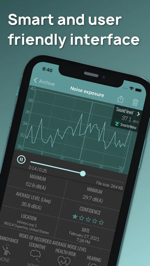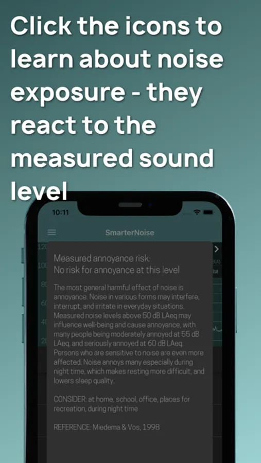 SmarterNoise features smart icons that react to the measured sound levels based on current research results focusing on the health and the adverse effects of noise pollution. With the SmarterNoise icons you easily understand how hearing, cognitive performance, and health may be affected by different levels of noise exposure. The awareness of harmful noise is increasing globally, and is considered a versatile risk factor for well-being and health, especially in noise polluted urban environments.