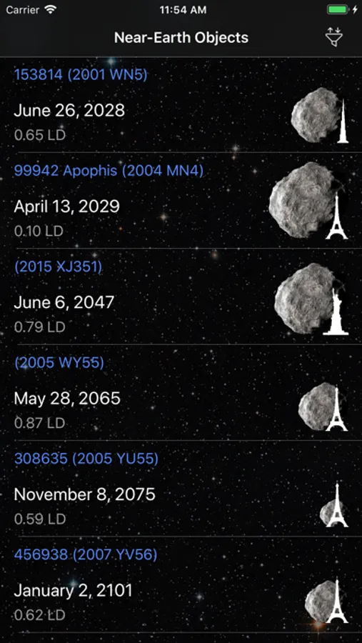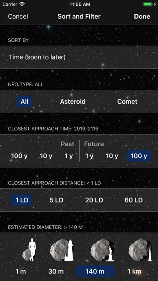 This app helps you discover near-Earth objects (NEOs). Filter by their type (asteroid or comet), closest approach time, closest distance, and diameter.