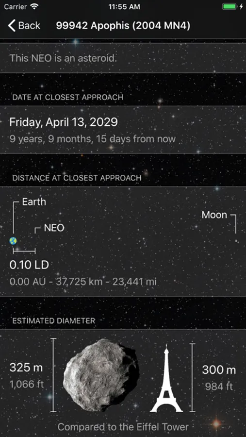 For each NEO, the app shows you an Earth-Moon model with the asteroid (or comet) indicated at the proper location. The app also helps you understand the NEO's size by comparing it to a familiar object.