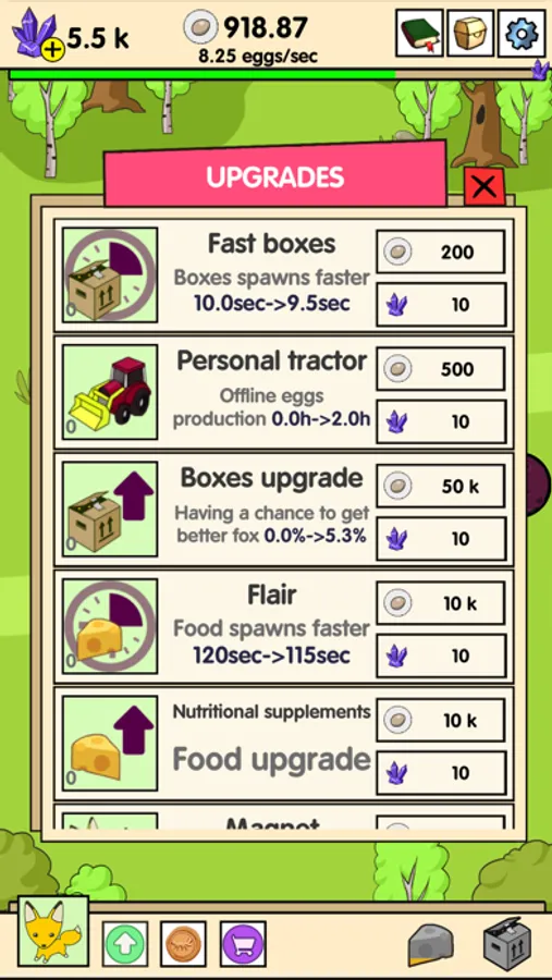 • No need for a long wait boxes: use foxes coins to buy new creatures and make even more money