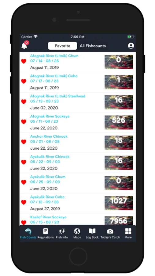• State wide fish counts that are updated continuously & automatically throughout the day and can be configured to send alerts. View targeted escapement goals, view up to 5 years worth of historical data, and even view every single river & species tracked in Alaska all on one page.