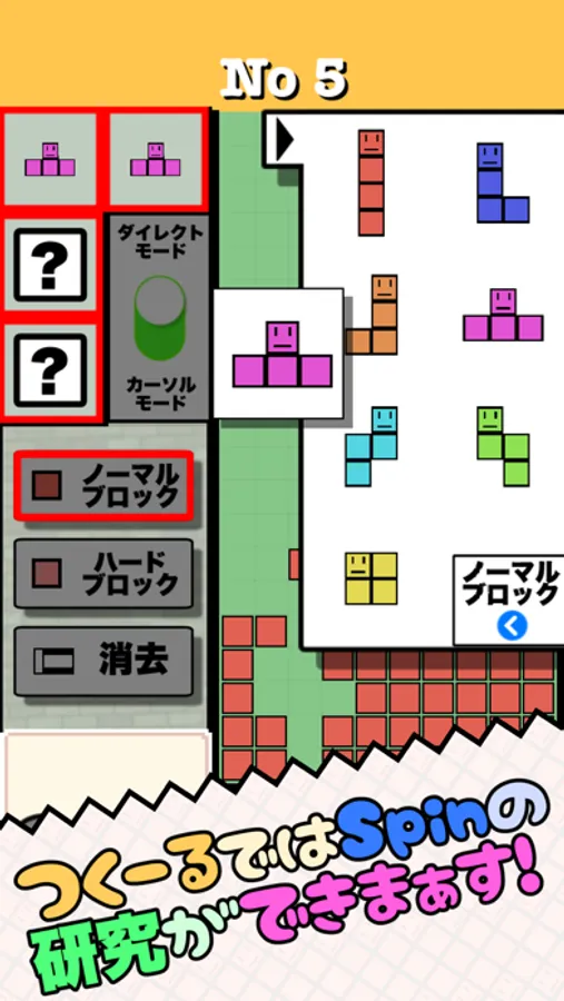 ブロックを自由に配置し、連鎖やスピンの動作を確認することができます。