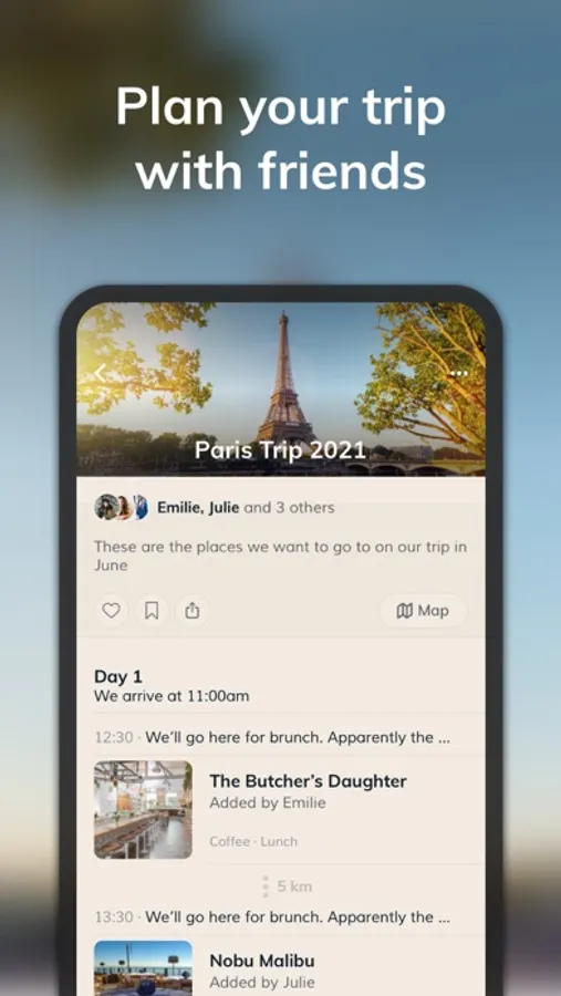 Plan and organize your trips together with friends. Select a destination, invite your friends, find the best recommendations and start planning your trip together.