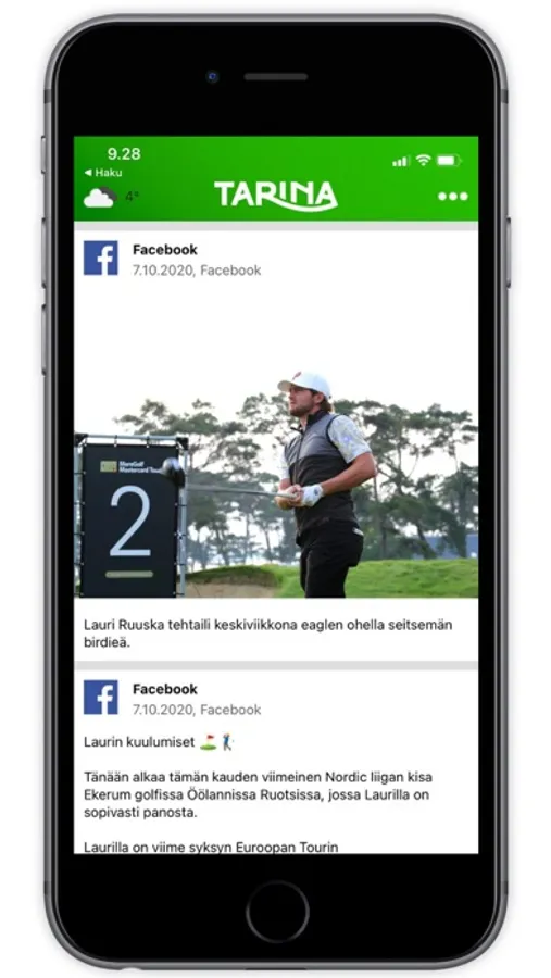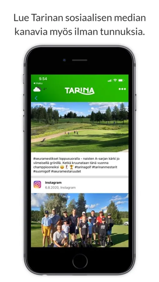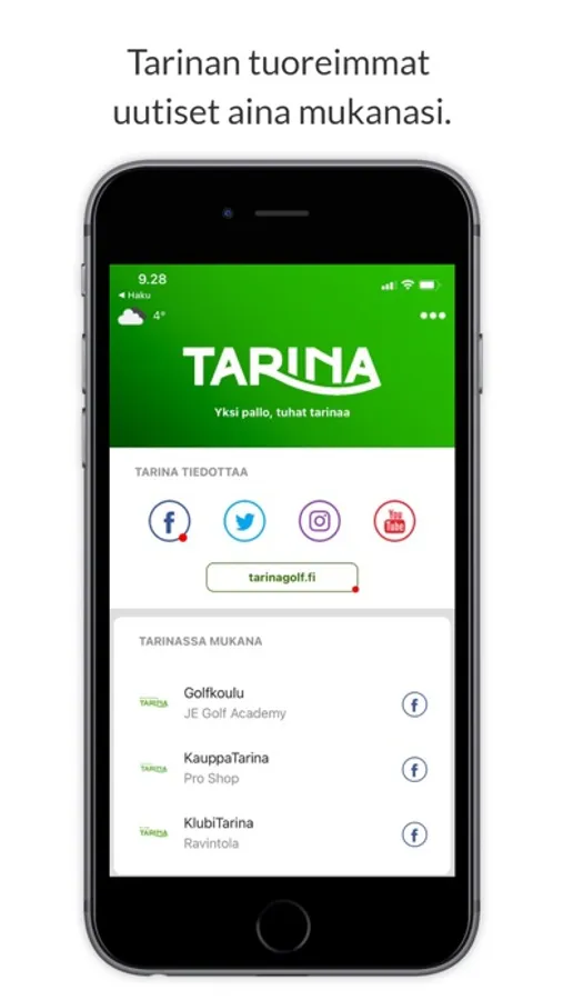 OmaTarinasta löydät kaikki Tarina Golfin tärkeimmät tiedotuskanavat sekä oheispalvelut ja yhteistyökumppanit. Sovellus antaa ilmoituksen saapuneesta uutisesta ja käyttäjä voi itse valita ne kanavat, joista hän haluaa ilmoituksia. Sovellus ei vaadi erillistä kirjautumista, joten voit seurata Tarinan sosiaalisen median kanavia kirjautumatta.