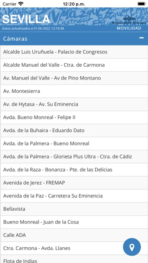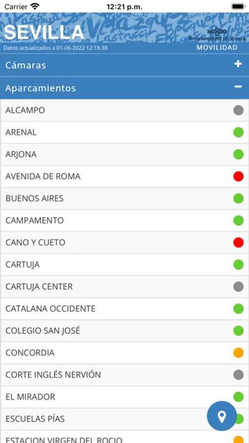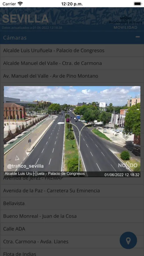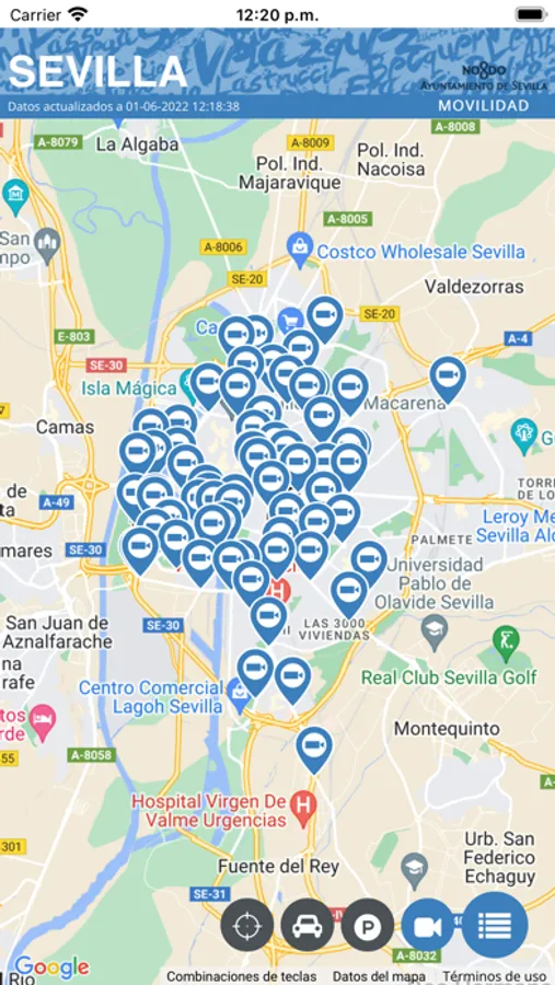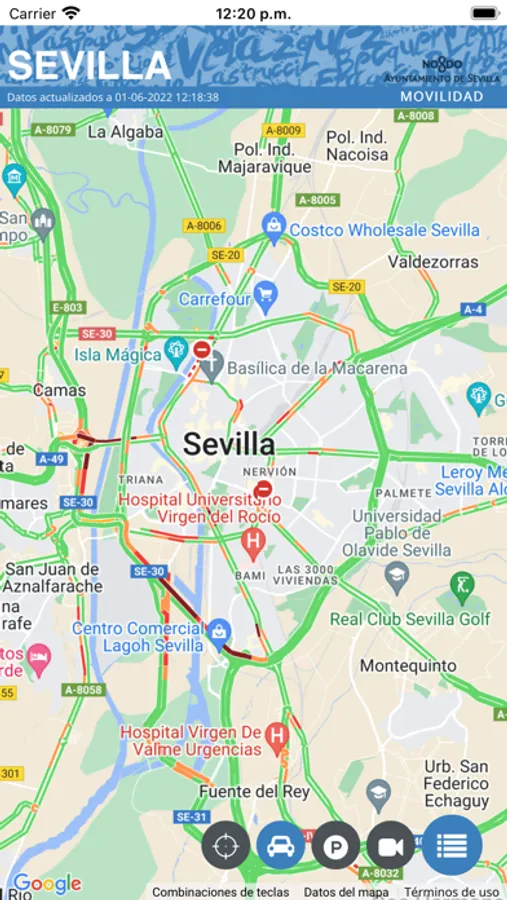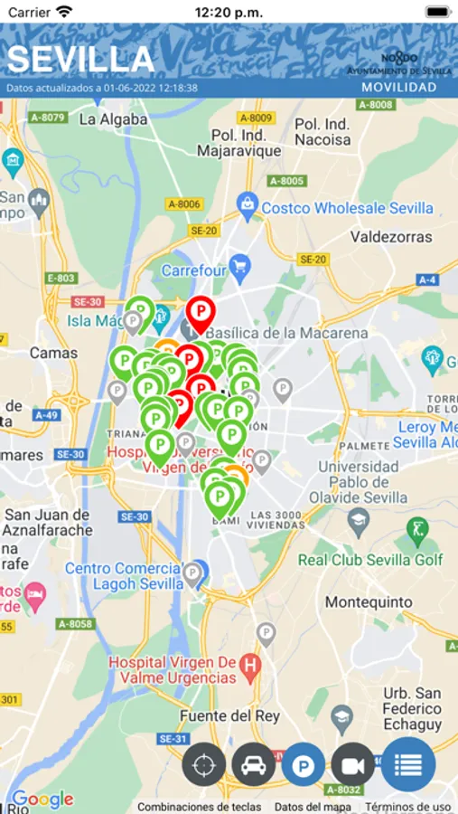 La APP permite conocer el estado de ocupación de diversos estacionamientos distribuidos a lo largo de la ciudad y ver el estado del tráfico a través de la ocupación de las vías y de las imágenes capturadas de las cámaras de vigilancia del tráfico publicadas en https://trafico.sevilla.org