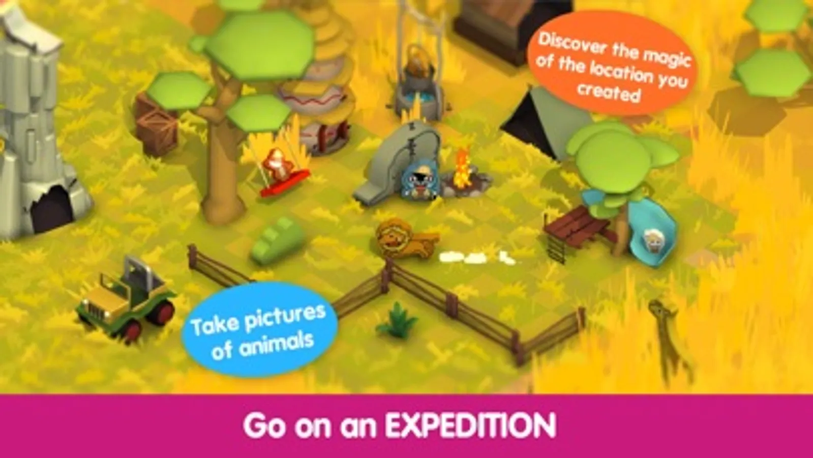Thanks to you, Pango and his friends can take pictures of wild animals and follow them in an SUV or minibus. To refresh themselves, they'll dive into a waterfall and take advantage of the shade of giant trees to slide, trampoline or swing. Once night falls, they'll choose a place to sleep before dancing around a very festive campfire.