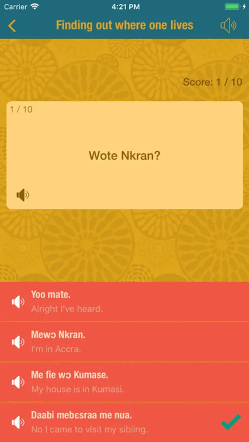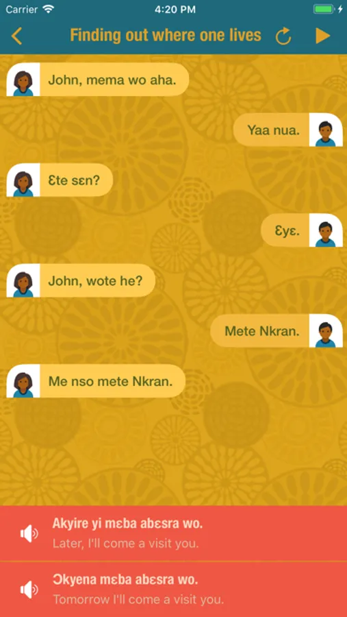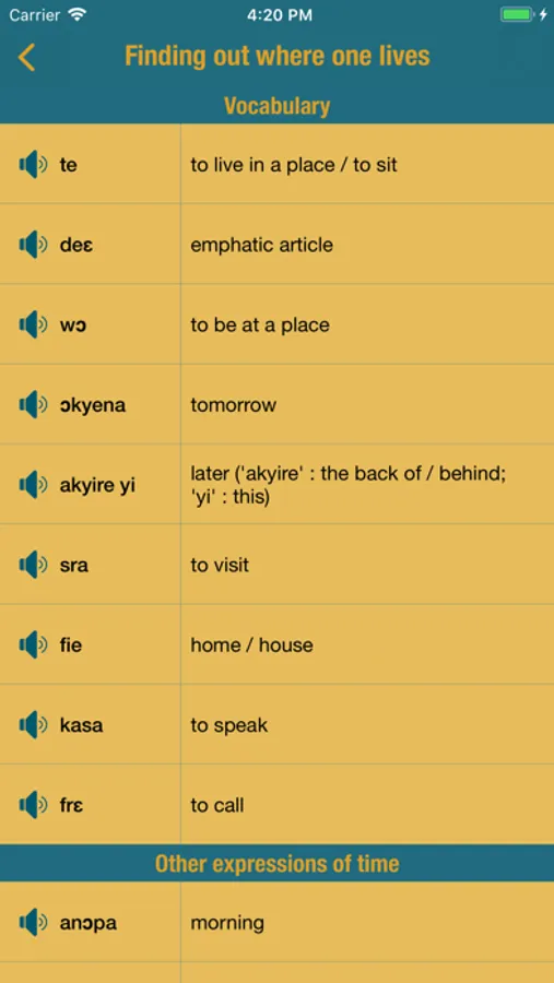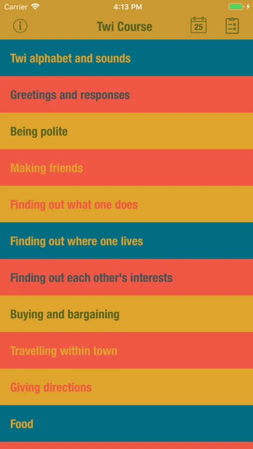 Twi Comprehensive is divided into three sections; Vocabulary section, Dialogue section and Exercise section. The main focus of what the app deals with is the spoken language, and every effort has been made to ensure that the dialogues are as natural and as close to current everyday usage as possible.