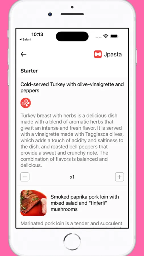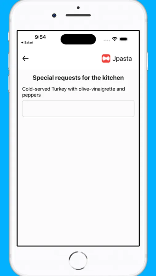 Ordering your meal has never been easier! Our app allows you to browse the restaurant menu of the hotel and choose your preferred meal. You can specify your dietary preferences and any other requirements, so that our chef can prepare the perfect dish for you. The app makes it easy and quick to place your order. If you forget to order for a meal, Jpasta will remind you to do so.