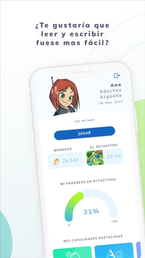 Con Dytective mejorarás tus habilidades de lectura y escritura mientras te diviertes jugando: 42.000 juegos se personalizan teniendo en cuenta tus puntos débiles y tus puntos fuertes para que te superes día a día. Cada reto o sesión de DytectiveU dura de 10 a 20 minutos. Recuerda que es muy importante que utilices Dytective de manera sistemática, realizando 4 retos o retos semanales, así podrás observar increíbles mejoras en tu lecto-escritura. Dytective no sustituye la intervención de un profesional, se trata de un apoyo a la intervención.