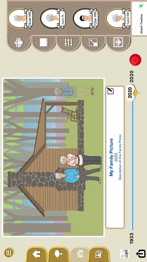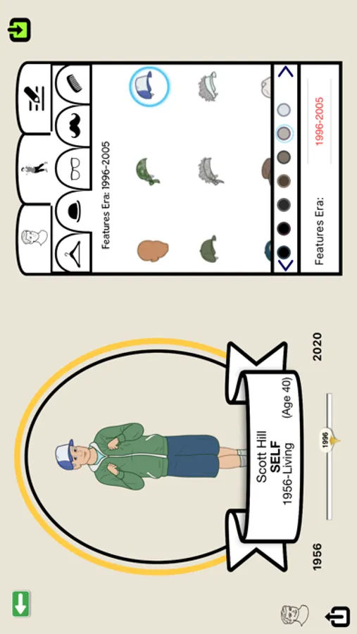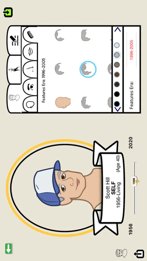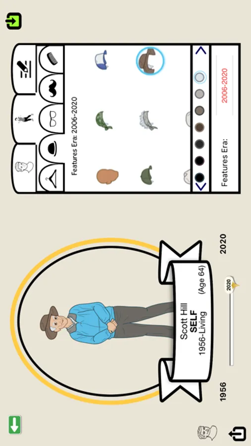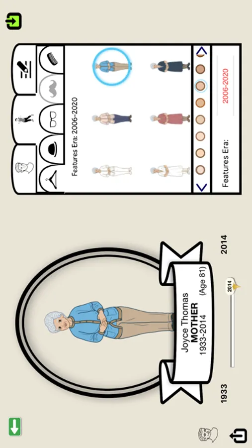 Second, the user BUILDS the avatar representing each members in their Family Tree by selecting from a wide variety of facial features and era-dependent hair styles, clothes, hats, etc.—all in living color. In addition, they can view how a family member might have looked at different times in their life using a Timeline feature.