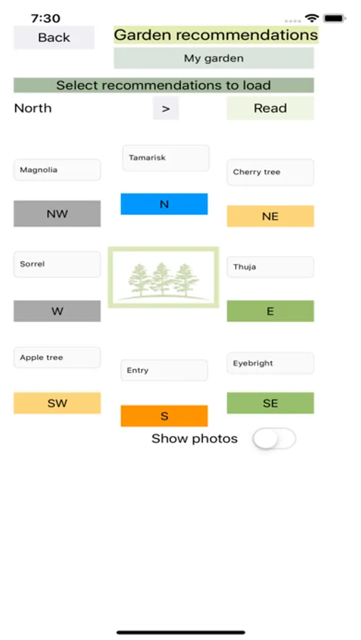 Many Feng Shui recommendations depend on the compass directions. That is why you will first create a new garden layout and enter the main distinguish characteristics of each direction (for example, pond, lawn, fruit tree). Then you can use the appropriate buttons to read specific recommendations on plants and life topics.