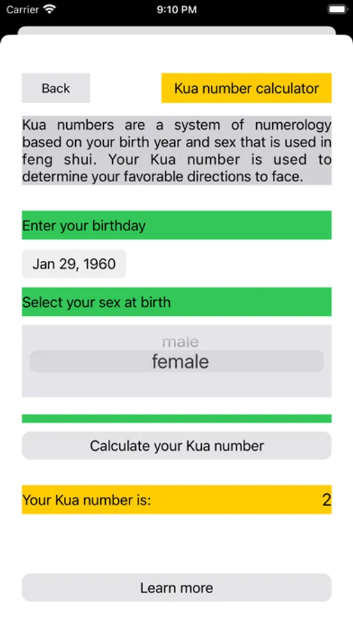 With the Kua calculator you can calculate your personal Kua number and use the power of your favorable directions.