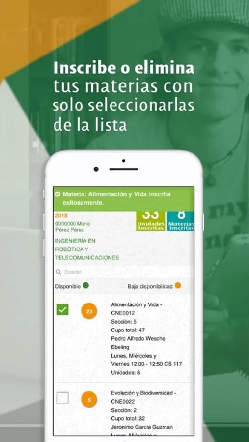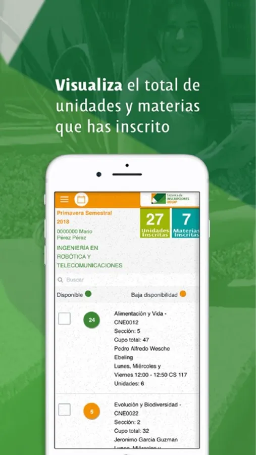 Identifica el cupo de materias de acuerdo al semáforo con colores verde/amarillo que te ayudarán a diferenciar aquellas con mayor o menor disponibilidad.