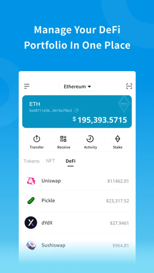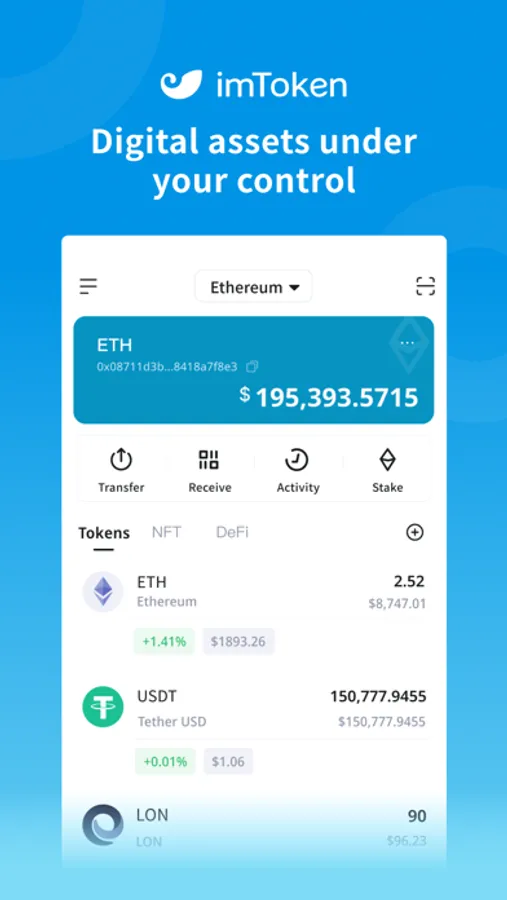 imToken allows you to easily manage a wide range of assets on various blockchains including BTC, ETH, ATOM, EOS, TRX, CKB, BCH, LTC, KSM, DOT, FIL, XTZ, and quickly view DeFi tokens like Uniswap(UNI), Compound(COMP), yearn.finance(YFI) and ERC721 & ERC1155 NFT. imToken also supports popular stablecoins such as USDT, USDC, DAI, PAX, TUSD and USDX.
