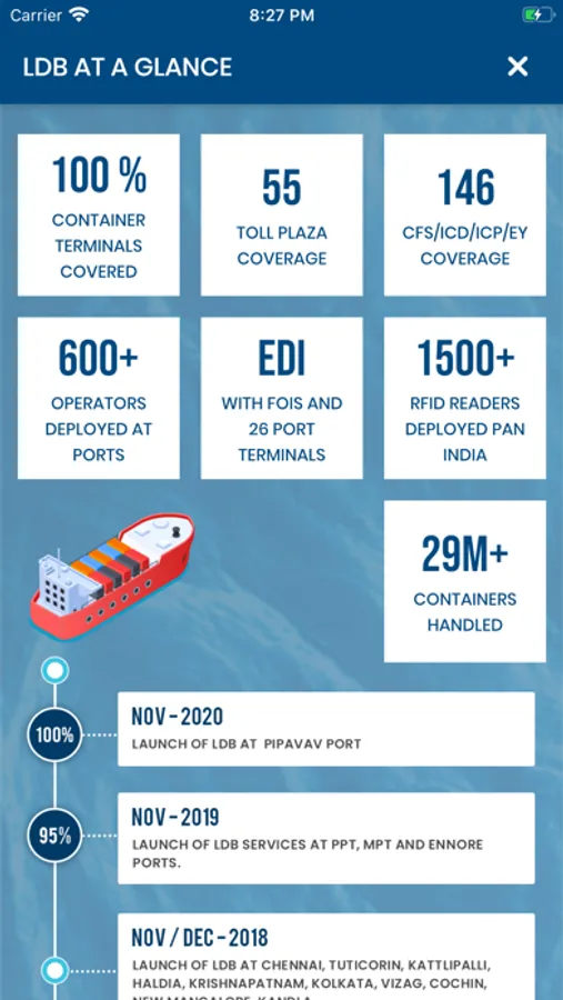 Logistics Data Bank (LDB) provides container visibility service across all key Indian container terminals during its journey through Road, Rail and Sea. Our services help stakeholders track Containers, compare performance metrics and bring in much required visibility and transparency across supply chain. The new features also provide high sea visibility of the containers starting from Port of Origin to Port of delivery with transhipment and transit points. LDB system is integrated with Terminal Operating Systems (TOS), Freight Operation Information System (FOIS) and other third party EXIM data sources.