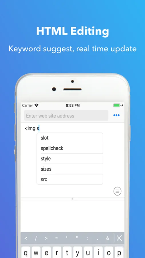 With SnippetEditor, you can edit html/ECMAScript/CSS code and see the results right away. It supports the standard console log to debug your script. This app is designed to be an offline tool where no internet connection is required. However you can also go online and see any sites's source code. While you are at it, you can modify its source code and see the changes right away!