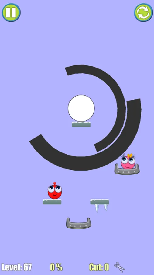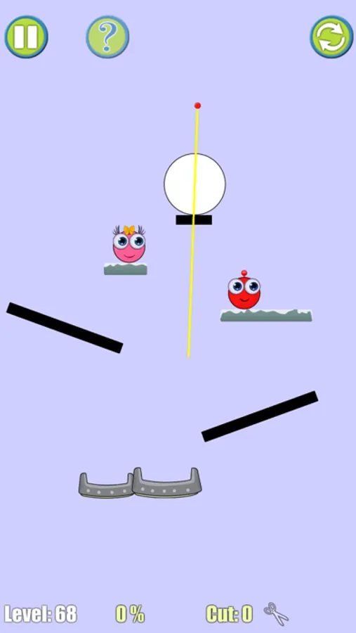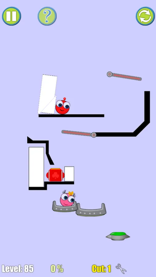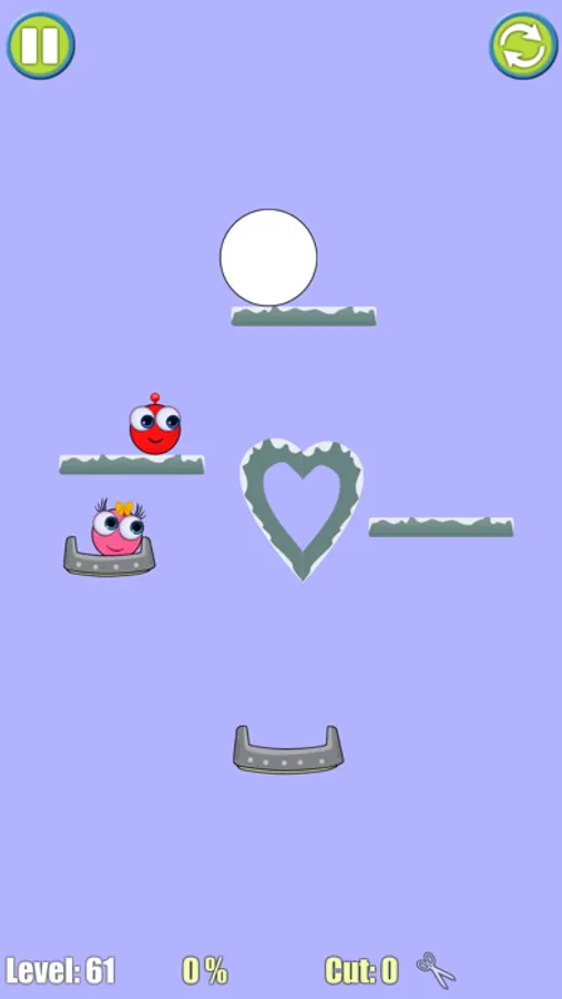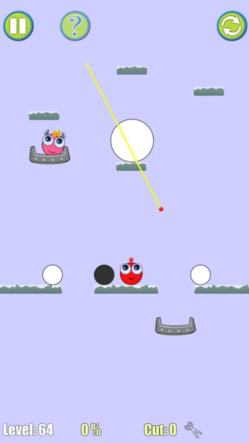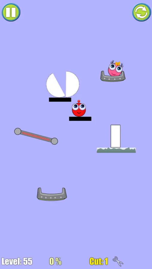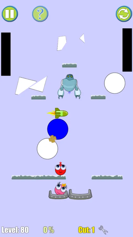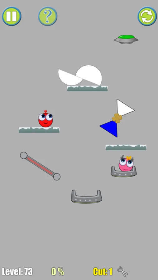 You will use your finger to cut the white blocks that go down and the blue blocks that go up. Gray and black bricks are impossible to slice and doesn't give you any cutting game points. Black blocks can't move or drop. Drop the red ball shaped alien to his space ship. Cut 51 percent or more of the shapes. It's not a game for hurrying people, this game is designed for smart people. Most of the levels can be completed with one cut.