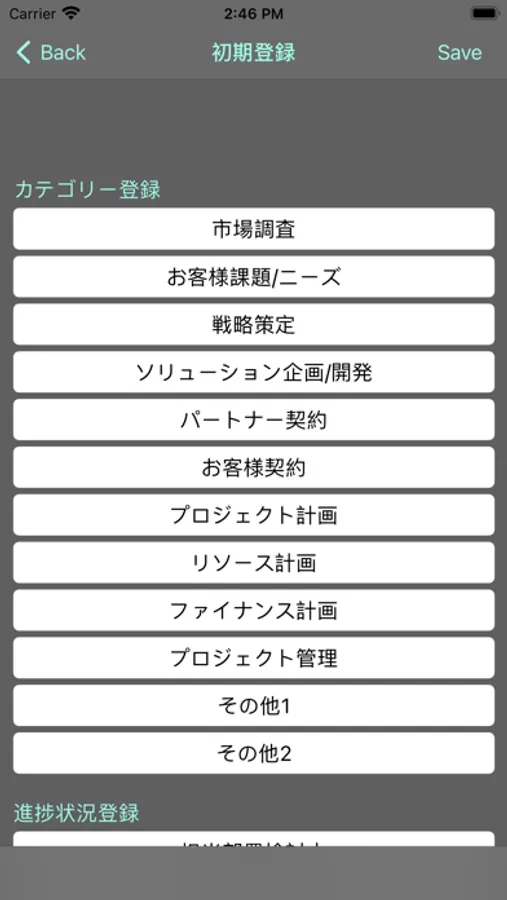 課題やテーマ、イベント等に関しては、ご利用者が自由にカテゴリーを設定できます。また、進捗管理のため、当該部門等に合わせて進捗状況の設定もできます。