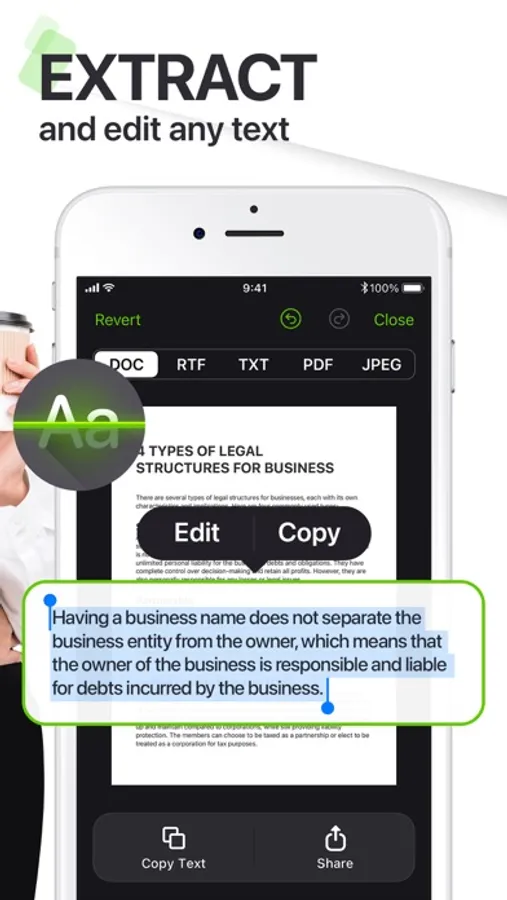 Scan texts, edit, annotate or sign and save them to all popular file formats.