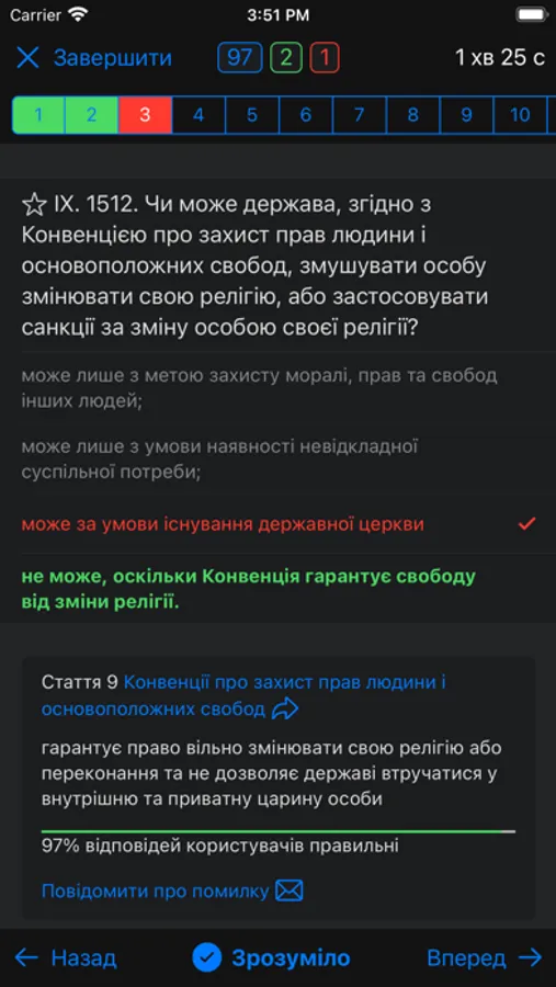 - Тестування по питанняx будь-яких вибраних розділів: підряд, випадково або за важкістю;