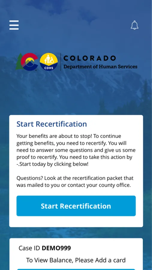 The MyCOBenefits App provides simple and secure way to manage your Food (SNAP) and Cash assistance benefits right from your phone. You can apply for benefits, complete recertification and request supportive services .Also you can view the current EBT card balance and transactions by simply adding the EBT cards to your account. You can sign-in using your PEAK credentials. If you do not have a PEAK account, you can register either through MyCOBenefits App or by visiting www.colorado.gov/PEAK.