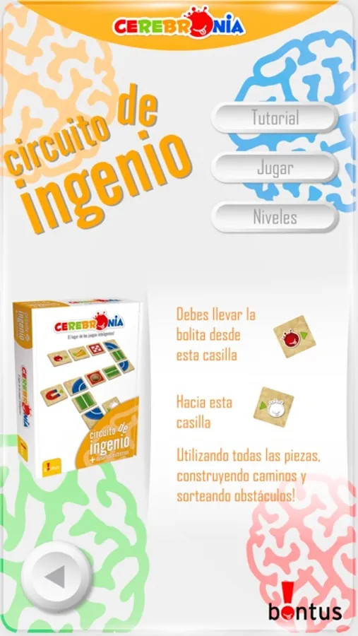 Juego 1. Circuito de Ingenio. Aquí tienes que construir caminos utilizando piezas rectas, curvas, rampas etc. para llevar una bolita desde un lugar hasta otro; en el camino tienes que sortear obstáculos como vallas y pozos, utilizando rampas, imanes, resortes y tu ingenio! Contiene 30 desafíos, de dificultad creciente, para que agudices tu ingenio y agilices tu cerebro!
