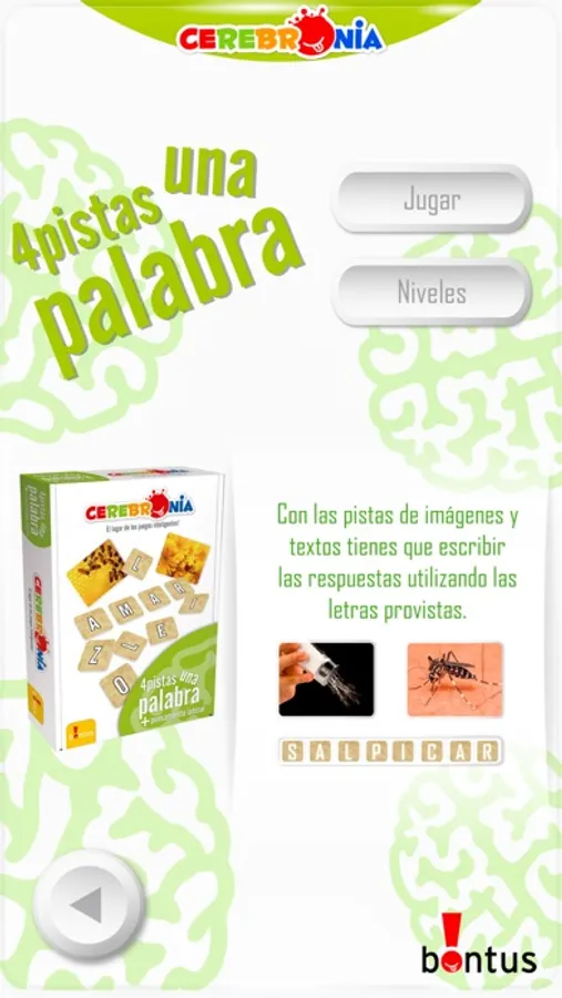 Juego 3. 4 Pistas una palabra, basados en el exitoso juego "4 fotos una palabra", en este juego se provee de 4 pistas para descubrir una palabra clave, algunas pistas son de imágenes y otras de texto. Hay 30 desafíos de dificultad creciente. Y, en el juego de mesa (ver el sitio bontusgames / cerebronia) se incluyen desafíos de Pensamiento Lateral; en los que tienes que utilizar tu imaginación para resolver problemas... sin lógica!. Este juego estimula la atención, la imaginación, la creatividad y la comunicación interpersonal!