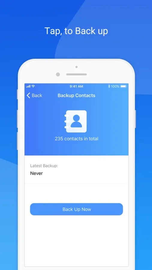 1. Easily back up your contacts in seconds in an .vcf file. Vcf is a regular contact backup format that can be opened in any iPhone or android devices.