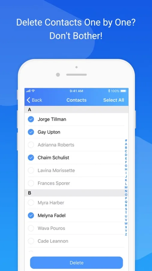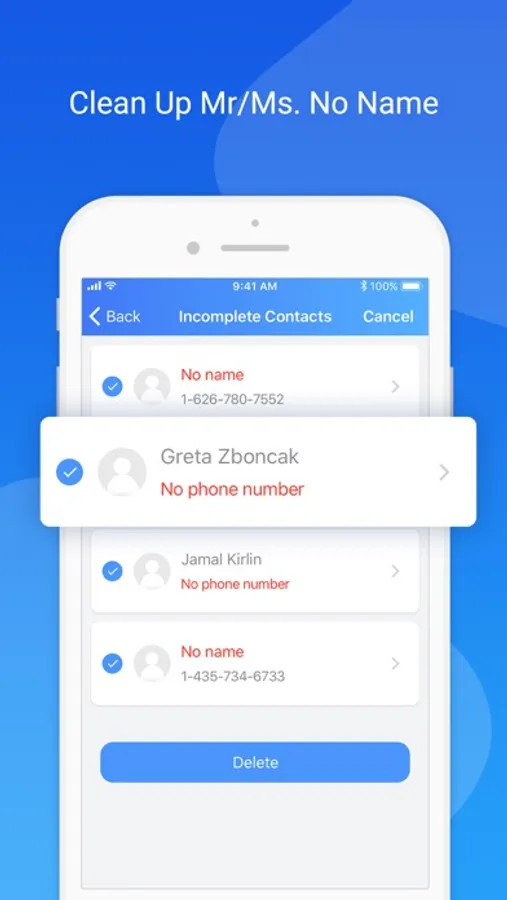 3. Preview and select incomplete contacts and easily clean them up in one tap.