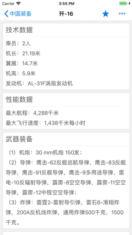- 武器性能排行榜,探索武器对抗可能性,用数据说话,客观对比各种武器参数,如航程、飞行速度、最大起飞重量等;