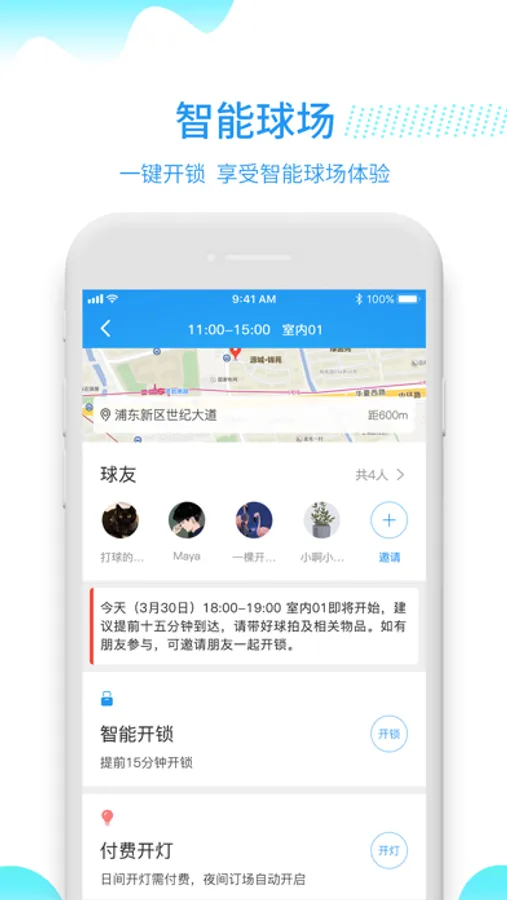 韵动吧提供丰富和多样的场地服务,通过线上应用,便可实现一键开锁、智能照明、高清摄像等多种功能,享受智能场地服务。